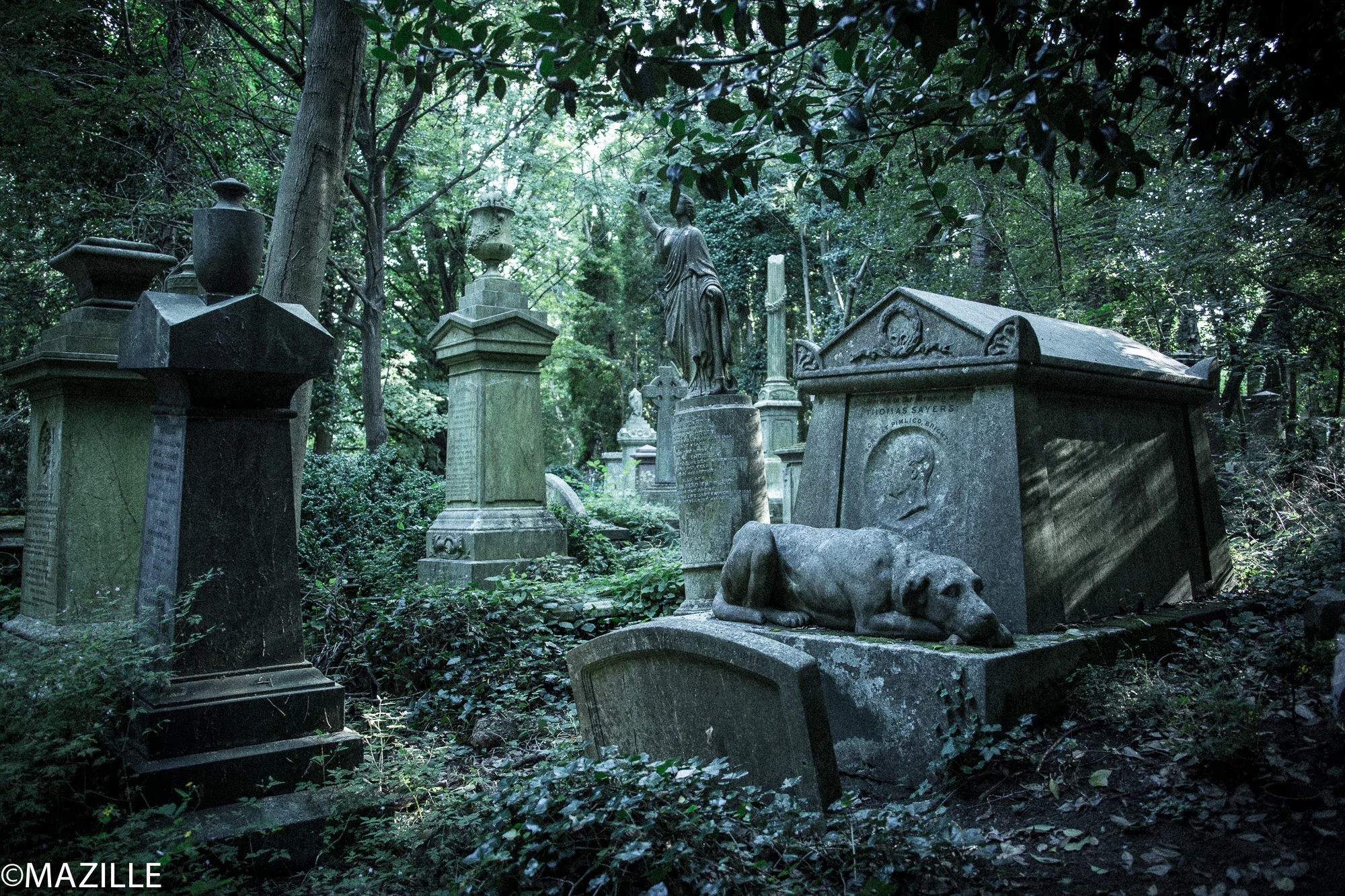 Dans quelques pas, nous pénétrerons dans le légendaire cimetière de High Gates. Connu pour accueillir entre autres la dépouille de Karl Marx, de Malcom McLaren le producteur des Sex Pistol, Herbert Spencer… nous nous dirigeons de l’autre côté, une zone interdite au public. La canopée étouffe les sons, à peine à quelques km de la city, nous avons l’impression d’être dans une autre dimension, confinés dans une forêt elfique. Le lière court sur le sentier et ondule de sépultures en sépultures tel des vagues. Sous lui, de la mousse peine à retrouver le soleil. Et sous cette mousse les pierres tombales sont noyées sous l’océan végétal. La vigne vierge s’élance en colimaçon autour des croix celtes, dont les bras parviennent à émerger entre deux vagues comme un naufragé qui ferait signe. Avec calme et déférence, nous rejoignons le coeur du parc. Muse semble impressionnée. Selon les dires du voisinage, ce cimetière serait hanté. La nuit, des mystiques escaladent les murailles d’enceinte pour y faire des messes noires ou implorer les esprits. C’est ici-même, dans ces brumes étranglées par les arbres, que Tim Burton a façonné l’ambiance à la fois paisible et inquiétante que l’on retrouve dans ses films. « Nous ne cherchons pas les gnomes aujourd’hui! », lance Ian, le gardien des lieux. Les renards profitent d’une petite résurgence coulant au pied de la tombe de Tesla. D’après lui, c’est un bel endroit pour se cacher et attendre qu’ils viennent se désaltérer.